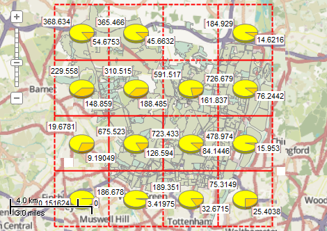 This example demonstrates how to do a segmentation of layers by regular grid, to calculate the percentage of land usage for each cell and to show it as pie charts. The combined extents of 2 polygon shapefiles are split by regular grid with 4 by 4 cells, which is represented by polygon shapefile. An intersection for each cell of grid and each input shapefile is calculated.To visualize the relative area of polygons obtained by intersection a temporary shapefile with charts is created. Each chart denote the percentage of area covered by one of the input shapefiles in the given cell. Note: the grid mentioned in this example has nothing to do with Grid class provided by MapWinGIS. The displayed areas are represented in hectares. Here is a screenshot with the results of the code execution.
